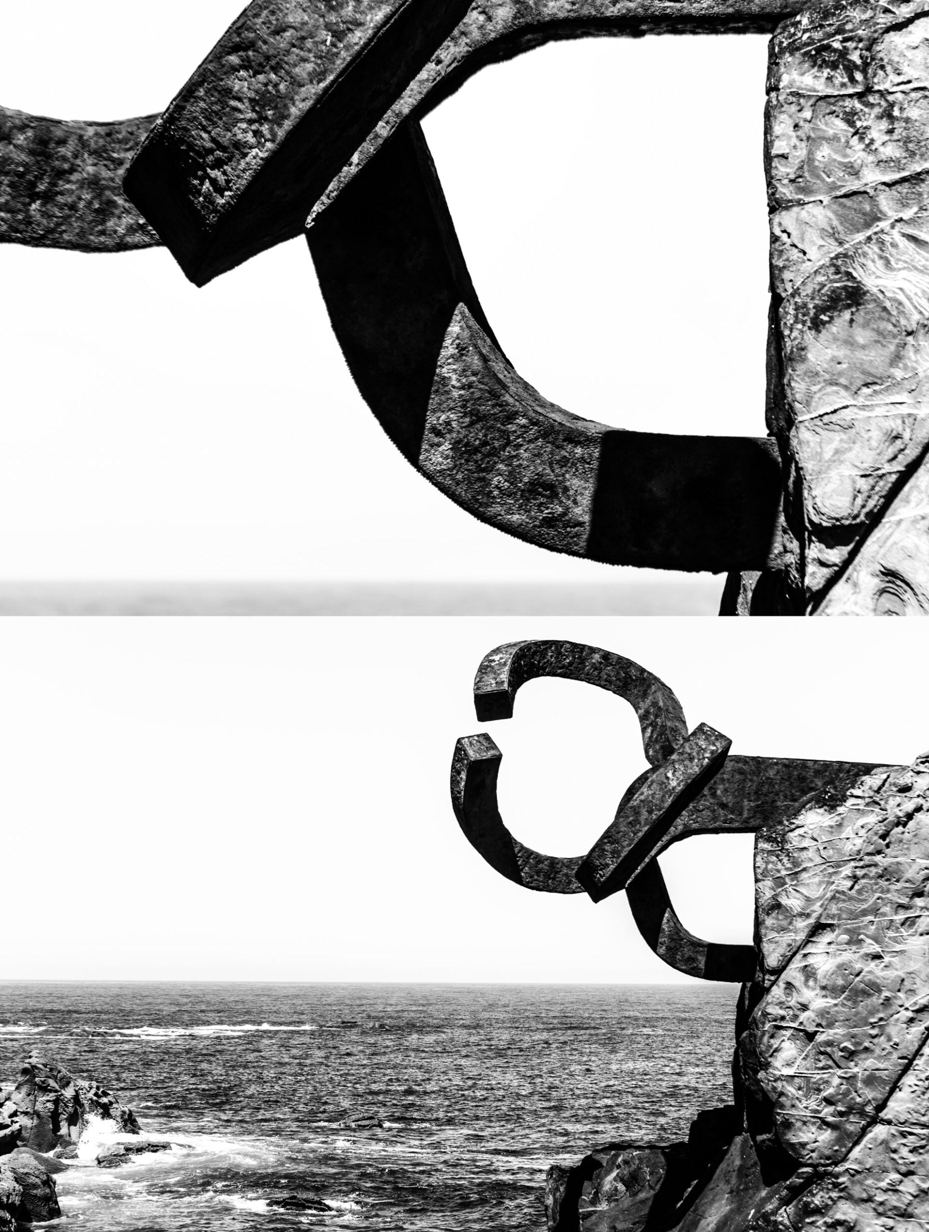 Esculturas de Chillida-Peine de los Vientos, en blanco y negro, con el horizonte del mar de fondo.